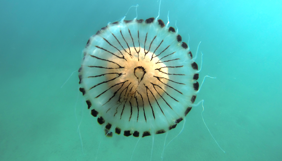6. Kelp, dahlia anemone, stalked jellyfish and velvet swimming crabs.